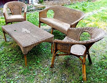 Salotto completo vintage da giardino in rattan con intelaiatura in bambù. Non spedisco, solo ritiro sul posto.