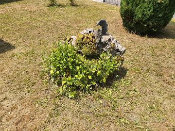Perfetto per decorare giardini o spazi esterni, questo sasso ha una forma unica e alcune piante che lo circondano, donando un tocco naturale e originale all'ambiente.