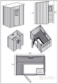 Sauna da giardino mt 1,80x1,20 dove trovano posto una persona distesa e una seduta, con stufa regolabile a 2 o 4 KW 220 V, completa di clessidra, termo-igrometro per controllo temperatura e umidità, secchiello con mestolo. Visibile a Riola (BO). Costo 2.200 €. L'assemblaggio è molto semplice e non occorre nessun attrezzo particolare, volendo posso comunque provvedere io sia al trasporto che al montaggio. Marco cell. 3200840459
