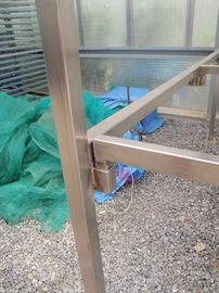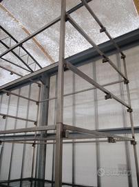 Scaffalatura componibile in acciaio inox 304 provvista di 6 ripiani con fondo in rete zincata e plastificata particolarmente rigida con maglia 2,5 x 5 cm, idonea per uso alimentare e per ambienti umidi come le serre e le celle di incubazione. N..3 moduli lunghi 14 metri con larghezza 1,55 m. e altezza 3,30 m.