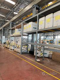 Vendo per inutilizzo N. 2 campate di scaffalatura porta pallet marca BFTM di colore grigio chiaro( sono le 2 centrali in foto con i ripiani in legno)