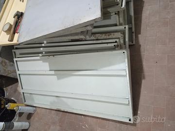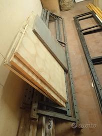 scaffali di ferro robusti ,smontati ho ripiani lunghi 80cm profondità 55cm e ripiani lunghi 1,15mt profondità 50cm i montanti sono lunghi 3pz3mt e 3 PZ 3,01mt il prezzo è per tre montanti e dodici ripiani completi di ganci