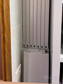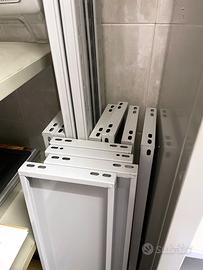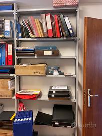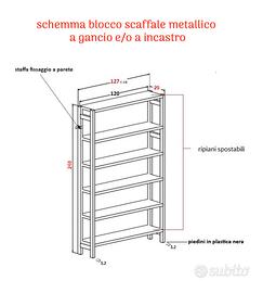 Scaffali metallici a gancio, colore grigio chiaro. Ripiani: 1,20 mt X 20 cm