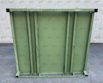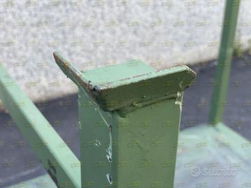 Pedane o scaffali mobili sovrapponibili ad incastro in acciaio verniciato colore verde serie pesante. Hanno una duplice funzione: A) utilizzati come pallet da trasporto B) per la realizzazione di scaffalature da magazzino così da non dover ricaricare la merce. Hanno le slitte anti ribaltamento, sono costruiti con tubolare d’acciaio sezione quadra mm60x60, la base è in lamiera liscia con sottostruttura di rinforzo che funge anche da guida per le forche del carrello elevatore. I montanti, sul lato lungo, sono raccordati con tubolare d’acciaio sezione quadra da mm 40x20. Lotto di BUONA QUALITA’: possibili e limitati segni di ruggine superficiale, il tutto come da documentazione fotografica. Misure mm 1520 x 1370 h1330, disegno tecnico su richiesta. Proposti da Polycube srl riferimento codice MP054-26, possibilità di spedizione anche per piccoli quantitativi. Salvo il venduto. Prezzo e disponibilità su richiesta.