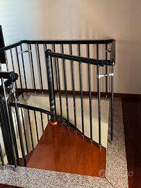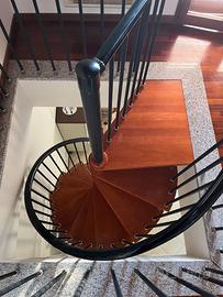 Scala a chiocciola diametro 130cm, altezza 315 cm. 12 gradini + sbarco a trapezio. Gradini in legno spessore 40mm, ringhiera e balaustra in metallo nero, corrimano in pvc nero.