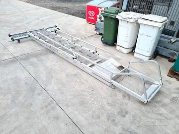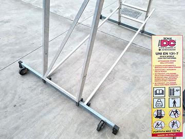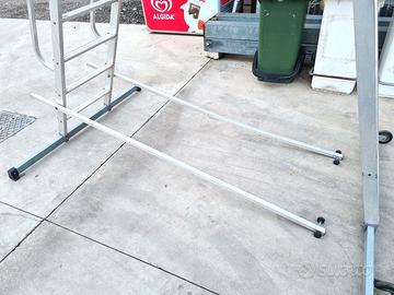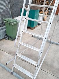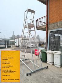 scala a palchetto chiudibile usata, si tratta di una scala pieghevole dotata di piattaforma e ringhiera di protezione e richiudibile per lo spostamento. per farla aprire con il pianerottolo in piano sarà da aggiungere un foro spostato di circa 10cm alle aste.