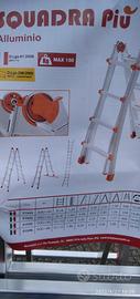 In alluminio. Utilizzabile a cavalletto, a sistema zoppo e allungata. Cerniere in acciaiao. Pioli zigrinati antisdrucciolo con passo di 280 mm. Pioli 30 x 30 mm. Uso professionale intensivo. Portata max 150 kg. A norme europee EN 131. 6 + 6 gradini. Altezza chiusa 180 cm. Altezza a forbice 306 cm. Altezza max 630 cm. Peso 16,5 kg.
