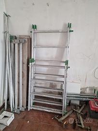 Trabattello Alumito 65 con base e elementi registrabilu a vite, alzate da 2 metri e parapetto da 1 metro. Tavole da 5 cm spessore. In pratica altezza di lavoro 4 metri rimanendo nelle norme di legge. Utilizzabile interno e esterno.