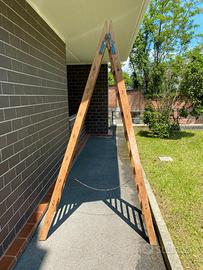 Per chi interessa una buona scala in legno doppia con 9 scalini per parte. condizioni buone usata poco pulita da macchie di colore si vedono qualche testimone di colore con cerniere in cima blu da ritoccare 4 tiranti di sicurezza in ferro posizionati sotto al 2 e 8 scalino entrambi i lati con catenella di sicurezza. Ritiro presso domicilio con furgone o vettura con portapacchi, oppure inviare un traslocatore per il ritiro, la spedizione e difficoltosa per mancanza materiale di imballaggio.