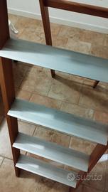 Scala in legno pieghevole con 4 scalini in metallo, ripiano e porta oggetti in metallo.