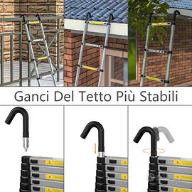 【Scala estensibile sicura e affidabile】La sicurezza viene prima di tutto! La scala alluminio è dotata di 2 ganci per un fissaggio sicuro, che aumentano notevolmente la stabilità quando si utilizza la scala in soffitta, soppalco, tetto, camper, albero ecc. Ogni gradino ha un doppio fermo di bloccaggio in altezza che si apre e si chiude individualmente per evitare di pizzicare le dita o le mani. La barra stabilizzatrice per un migliore equilibrio e i piedini angolati antiscivolo possono proteggere la tua sicurezza durante l'utilizzo.