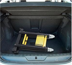 Caratteristiche tecniche: altezza estesa 5 m (2,5 + 2,5), altezza chiusa 92 cm, dimensioni da chiusa 90 × 47 × 9 cm, numero pioli 8 + 8 con passo da 30 cm, materiale in lega di alluminio con componenti in plastica tecnica, peso 17,5–18 kg, portata massima 150 kg, colore nero/giallo, struttura telescopica pieghevole, pedali antiscivolo, piedini in gomma, ruote rimovibili, meccanismo di blocco automatico per ogni livello, confezione con scala, doppia puleggia e istruzioni.