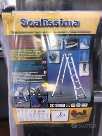 Scala in alluminio telescopica, cerniere in alluminio, piano porta attrezzi..