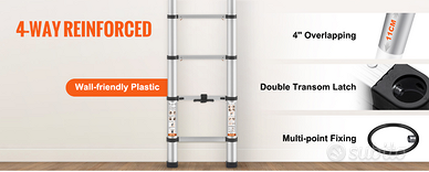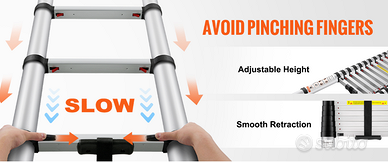 Eccellente capacità di carico: la scala telescopica VEVOR è realizzata in lega di alluminio aeronautico con una capacità di carico massima di 170 kg. Le parti dell'interfaccia in plastica sono rinforzate con nylon, che non si rompe facilmente e non lascia segni di plastica. Inoltre, ha superato i test ANSI e N131, garantendo una lunga durata.