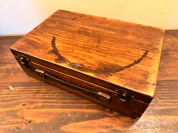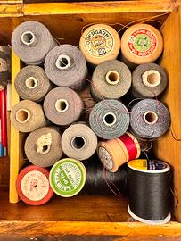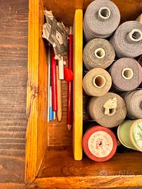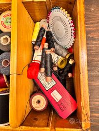 Scatola da cucito vintage con contenuto, tra cui numerose bobine di filo vecchio, alcune inutilizzate, di vari colori e spessori, e accessori. Il tutto contenuto in una scatola di legno di pino.