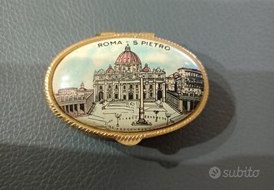 Scatolina vintage portapillole con raffigurazione di Roma San Pietro. Nuova, in ottone. Lunghezza 5 cm circa; Larghezza 4 cm circa; Altezza 2 cm circa. Da collezione!