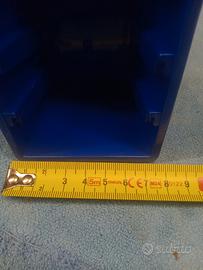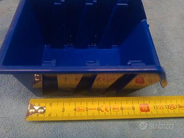 Pratici contenitori impilabili ad incastro, bocca di lupo in plastica, color blu, per tenere in ordine viti, bulloni rondelle e minuteria. Misure visibili nelle altre foto.