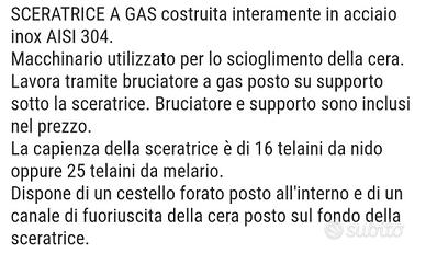 sceratrice a gas costruita interamente in acciaio inox, completa di bruciatore ottima per la fusione e il recupero della cera d api .