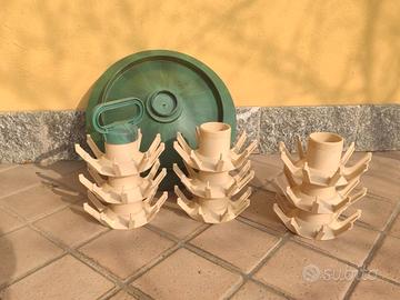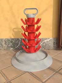 set di 2 scolabottiglie in plastica, il primo rosso con 45 posti, il secondo beige con 81 posti, entrambi con maniglia per facilitare il trasporto, componibili ad avvitamento, e base raccogligocce