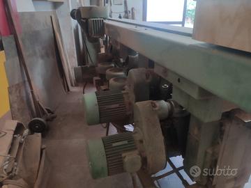 Scorniciatrice Weinig, fabbricazione 1980,dotata di sei alberi e con attacco di albero universale.permette di lavorare il legno da sei lati in un solo passaggio.lavorazione massima 17 cm larghezza.con frese per perlinatura dx sx,per rivestimenti dx sx,per telai di porte interne rotonde e mostrine dx sx.peso 25 quintali, lunghezza 4.44 m, larghezza 1,30 m.