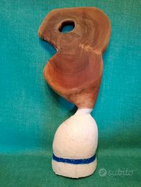 Scultura artistica realizzata in legno di ulivo. L'opera presenta una base bianca con una fascia blu.