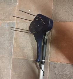Abbacchiatore scuotitore elettrico Meccanica Arpi, con cavo originale da 20 metri, doppio interruttore uno a bordo e uno sul cavo, morsetti a pinza per il collegamento su batteria tipo auto e asta telescopica da 3 metri. Ottime condizioni come da foto, usato poco. Riporto descrizione del produttore Elettrobrucaolive “Arpi” con impugnatura e asta telescopica, è caratterizzata da un principio di funzionamento completamente nuovo,brevettato, con 4 alberini a manovella, in acciaio, ruotanti fuori centro, provvisti di un forza periferica tarata per non rompere le olive, per non rompere i rametti, distaccando le olive mature e non mature facendole cadere in prossimità dell’operatore. E’ adatto a tutte le cultivar da olio dei nuovi e vecchi impianti coltivati in pianura,in collina, nelle zone impervie, in terreni a terrazze, ecc., ecc.. Peso attrezzo Kg. 1,240 Peso asta telescopica allungabile fino a 3 Mt, Kg. 0,720.