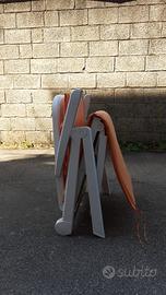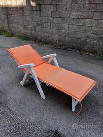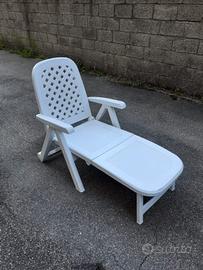 Sdraia/poltrona reclinabile da giardino in plastica bianca. Ha due comode ruote posteriori per facilitare lo spostamento. Includo cuscino arancione su misura.