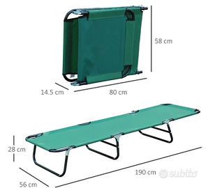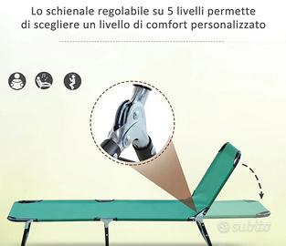 DIMENSIONI: Dimensioni piatte: 188L x 56P x 28A cm. Altezze schienale: 28 cm, 52 cm, 67 cm, 78 cm, 84 cm. Dimensioni ripiegate: 70L x 57P cm. Capacità di peso: 120 kg. Design completamente assemblato, per avere un lettino sdraio pronto all'uso