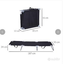 DIMENSIONI: Dimensioni generali: 187L x 55P x 24Acm. Altezza seduta: 24cm. Dimensioni piegata: 65L x 55P x 12Acm. Capacità di peso: 120kg.