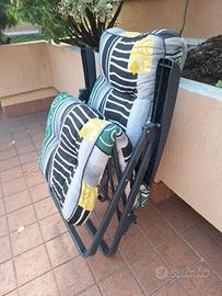 Poltrona sdraio pieghevole per esterni, con cuscino imbottito, regolabile in diverse posizioni con poggiapiedi. Nuova, mai usata perché inadatta alla persona che la ha comprata