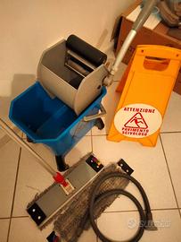 secchio carrellato ALEX I a cui è stato sostituito lo strizzatore a pressa con uno a rullo per mop a banda tipo "elparol", sistema più leggero ed efficace;