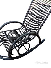 Sedia a dondolo in bambù in buone condizioni generali, struttura solida in ordine, cuscino integrale, prego contattarmi telefonicamente per appuntamento visione prova acquisto grazie.