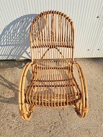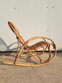 Poltrona a dondolo in bambù e rattan intrecciato, produzione italiana anni 60 70. Disponibile anche il cuscino con fodera a fasce bianche e verdi. Adatta per l'interno o esterno coperto come una veranda o portico, comoda e leggera da spostare. Buone condizioni generali con alcuni segni del tempo e di utilizzo, sempre tenuta dentro casa quindi non risulta scolorita dal sole. Disponibili 2 quantità, prezzo inteso cadauna.