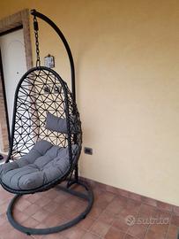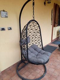 Sedia a Dondolo Poltrona Sospesa Pensile. Design Ovetto per Interno Esterno Giardino. Terrazzo Autoportante con struttura in Acciaio e Cuscini imbottiti color grigio. Portata 140 Kg Colore Nero. Misure: Altezza 195 cm Larghezza 1 metro