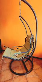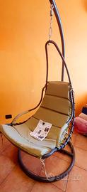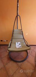 Sedia a dondolo sospesa in acciaio verniciato a polvere grigio con altezza seduta circa 55 cm, portata massima 100 kg; imbottitura verde in poliestere leggero lavabili adatta per patio o giardino o interni. Senza scatola originale ma con istruzioni montaggio/smontaggio.. Prezzo trattabile, da ritirare in sede