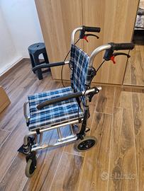 sedia a ruotelle pieghevole in alluminio, leggerissima da viaggio, se riduce a dimensioni molto piccole, ideale per viaggi in aereo o macchina. quasi nuova usata pochissimo.