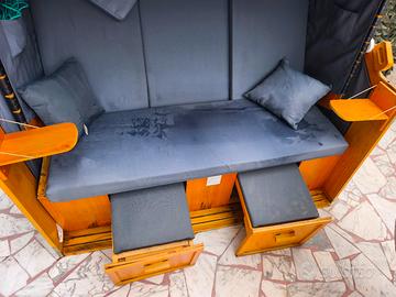 Poltrona 2 posti da giardino o da esterno in legno e vimini reclinabile. Nuovissima completa di cuscini e poggia piedi . Vendo per inutilizzo