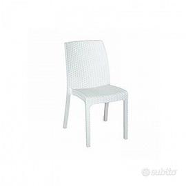 Sedia monoblocco impilabile in polipropilene. 100% resina riciclabile, con tappi antiscivolo. Finitura “rattan”.
