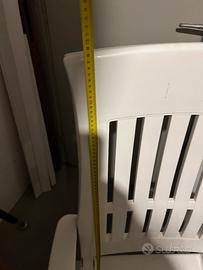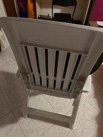 Sedia pieghevole in plastica bianca robusta con braccioli e schienale regolabile . Si offre insieme anche l’imbottitura per schienale e seduta Ingombri aperta Altezza seduta 45 cm Altezza schienale 68 cm Larghezza 58 cm Ingombri chiusa 88 x 63 cm