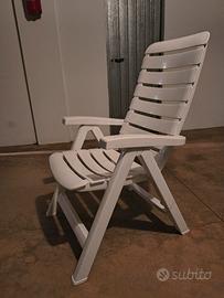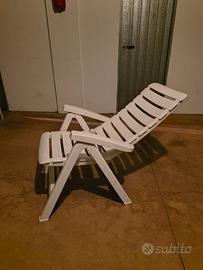 Sedia sdraio in plastica bianca. Oggetto robusto e pesante. Lo schienale è reclinabile (l'estensione massima si vede nella terza foto).