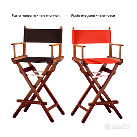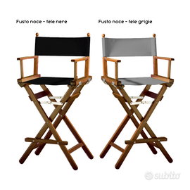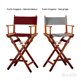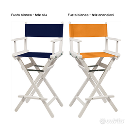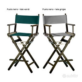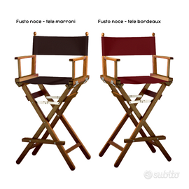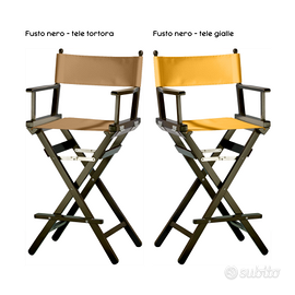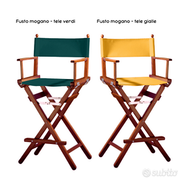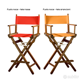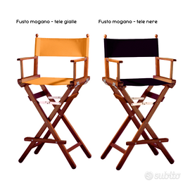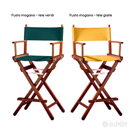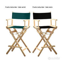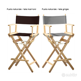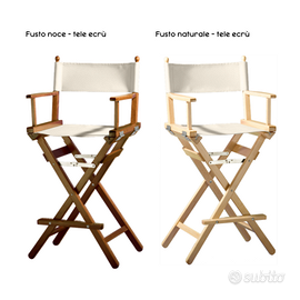 Sedia da regista in legno di faggio, robusta e leggera, con seduta e schienale in tela rinforzata.