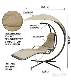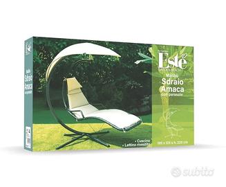 Caratteristiche Sdraio Amaca Malibù Esté Struttura tubolare in acciaio al carbonio Cuscino in poliestere Imbottitura in poliestere Parasole in poliestere Lettino rivestito in 70% pvc e 30% poliestere Laccetti in poliestere Spessore tubo: 60 mm Misure: l. 195 x p. 125 x h. 220 cm Altezza seduta: 44 cm Portata massima: 100 kg Pulire con un panno umido Colore: beige struttura antracite