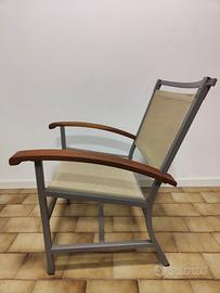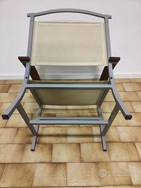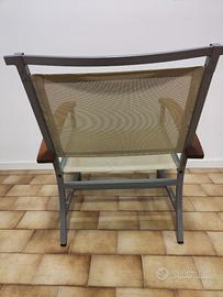 Vendo, come da foto, ad € 30,00, sedia in tessuto, con struttura in metallo e braccioli in legno. Dimensioni: altezza seduta 40 cm circa, dimensioni seduta 45 x 55 cm circa, altezza schienale 85 cm circa.