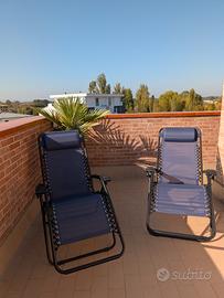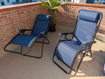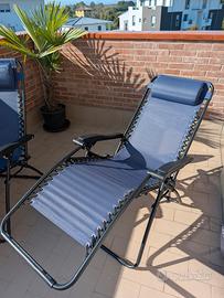 Coppia di sedie a sdraio "gravità zero" per giardino o terrazzo, in ottime condizioni pari al nuovo, complete di cuscini e richiudibili come da foto.