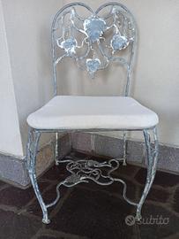 Tre bellissime sedie antiche in ferro battuto con relativi cuscini in cotone e lino imbottiti. Prezzo a sedia euro 40, se prese insieme scontate ad Euro 95.