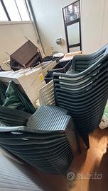 Circa 50 sedie bianche e verdi (3 modelli diversi) in plastica con una decina di tavolini verdi da esterno.