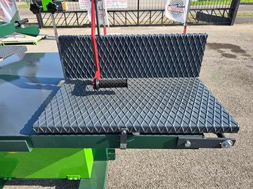 Ampio banco da lavoro con vassoio spingilegna scorrevole per facilitare il taglio