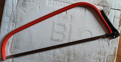Sega piccola usata ad arco in buone condizioni; l'arco è in acciaio tubolare verniciato rosso, con leva di serraggio, la sega è per tutti i tipi di legno, per l'uso professionale, uso universale, per l'edilizia, il giardino, la campagna, l'agricoltura, la selvicoltura, per legno secco, per legno verde e umido, ideale per tronchi e rami di grandi dimensioni, adatta per destrimani e mancini, la lama è in acciaio, lunghezza totale della sega mm 630, la lama è facile da sostituire vedi foto.