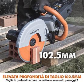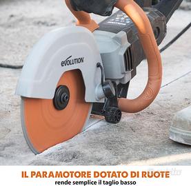 Sega circolare Evolution R255DCT 255 mm scanalatrice da muro circolare NUOVO. La Sega Elettrica per Cemento Evolution R255DCT trasforma il tuo modo di lavorare! Con una profondità di taglio di 102,5 mm, puoi affrontare anche mattoni più spessi in un solo passaggio, semplificando la lavorazione di calcestruzzo e pietra. Equipaggiata con un disco diamantato premium Evolution con una concentrazione di diamante del 30% in più rispetto li standard, questa troncatrice assicura tagli rapidi e duraturi. La sua progettazione ergonomica garantisce comfort e controllo, mentre la tecnologia Power Protect protegge dai danni causati da polvere e umidità. La piastra di protezione su ruote facilita i tagli sul pavimento, consentendoti di posare la macchina mentre la lama è in rotazione. Versatilità su tutti i materiali: Grazie al potente motore elettrico, puoi affrontare facilmente qualsiasi tipo di muratura, incluso il calcestruzzo armato. La posizione centrale garantisce un equilibrio perfetto per un controllo ottimale. Economica e pratica: Dimentica costi di gestione elevati! Niente più spese per carburante, batterie o manutenzione. Risparmia tempo e denaro senza compromettere le prestazioni. Sicurezza e affidabilità: La piastra di protezione rinforzata ti consente di lavorare con fiducia su qualsiasi superficie. L'angolo elevato mantiene la lama sollevata, permettendoti di posare la troncatrice immediatamente dopo l'uso. Ambiente di lavoro pulito: Il grande proteggi-lama fisso offre una protezione efficace contro i detriti volanti e ottimizza l'eliminazione della polvere, mantenendo il tuo spazio di lavoro sicuro e ordinato. Nessuna emissione tossica: Utilizza la troncatrice R255DCT in qualsiasi ambiente, senza preoccuparti di vapori nocivi. Lavora in sicurezza senza compromettere la salute.