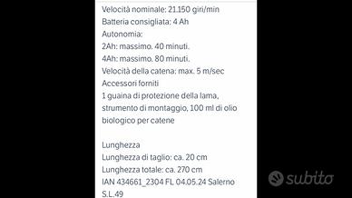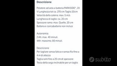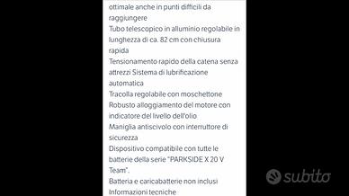 Sega telescopica parkside con braccio telescopico allungabile, informazione tecniche in foto, compatibile con tutti i modelli a batterie x20, si vende senza batteria e caricabatterie come da acquisto in origine, usato solo una volta, vendo per inutilizzo, condizioni pari al nuovo.